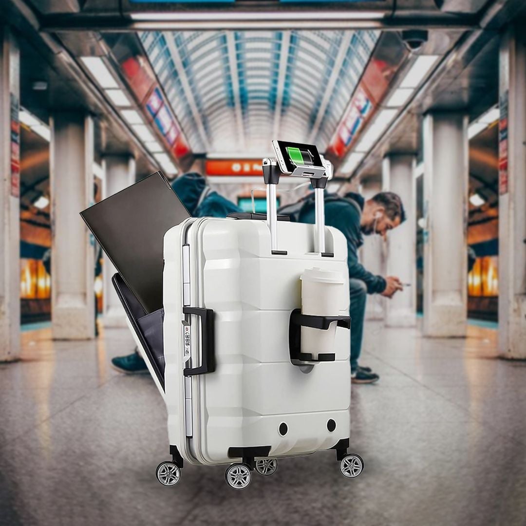 حقيبة سفر متكاملة بعجلات دوارة حيث تحتوي على حامل للأكواب، جيب أمامي للابتوب، منفذ USB، حامل للهاتف بالإضافة لقفل TSA