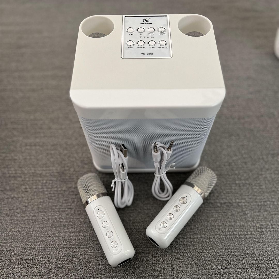 مجموعة مكونة من جهاز الكاريوكي، و2 من الميكروفونات اللاسلكية جهاز سهل الاستخدام، ولا يحتاج تركيب، كل ما عليك فعله هو تشغيلة فقط يتضمن الجهاز شريحة بلوتوث 5.0 مدمجة للبث اللاسلكي والاقتران الفوري كما توفر نقلًا أكثر استقرارًا ومسافة أطول تصل إلى 10 متر كل مايكروفون يقوم بالتقاط الصوت بسلاسة ونقله بسهولة ليوفر صوتًا واضحًا وقويًا حتى أفضل من الصوت الحقيقي كما يحتوي كل مايكروفون عل 5 أنماط مختلفة من الصوت، يمكنك الاختيار من بينها مثالي للاستخدام في الأماكن المغلقة أو الهواء الطلق أو الكاريوكي أو الحفلات أو الاجتماعات أو الزفاف أو الخطابات أو المدارس أو مراسم الافتتاح أو الترويج أو الدي جي أو العروض الحية الصغيرة على المسرح يعمل من خلال الشحن، حيث تم شحنه بالكامل لمدة تتراوح بين 3 ل4 ساعات مسافة الإرسال: 10 متر نطاق التردد: 20 هرتز-20 كيلو هرتز
