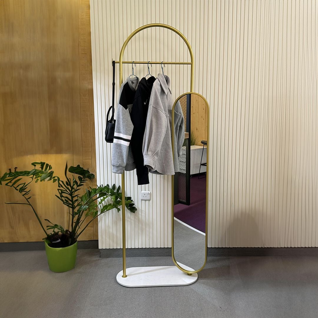 شماعة لتعليق الملابس مع مرآة وطاولة بحجم صغير بتصميم أنيق وعصري وعملي ..