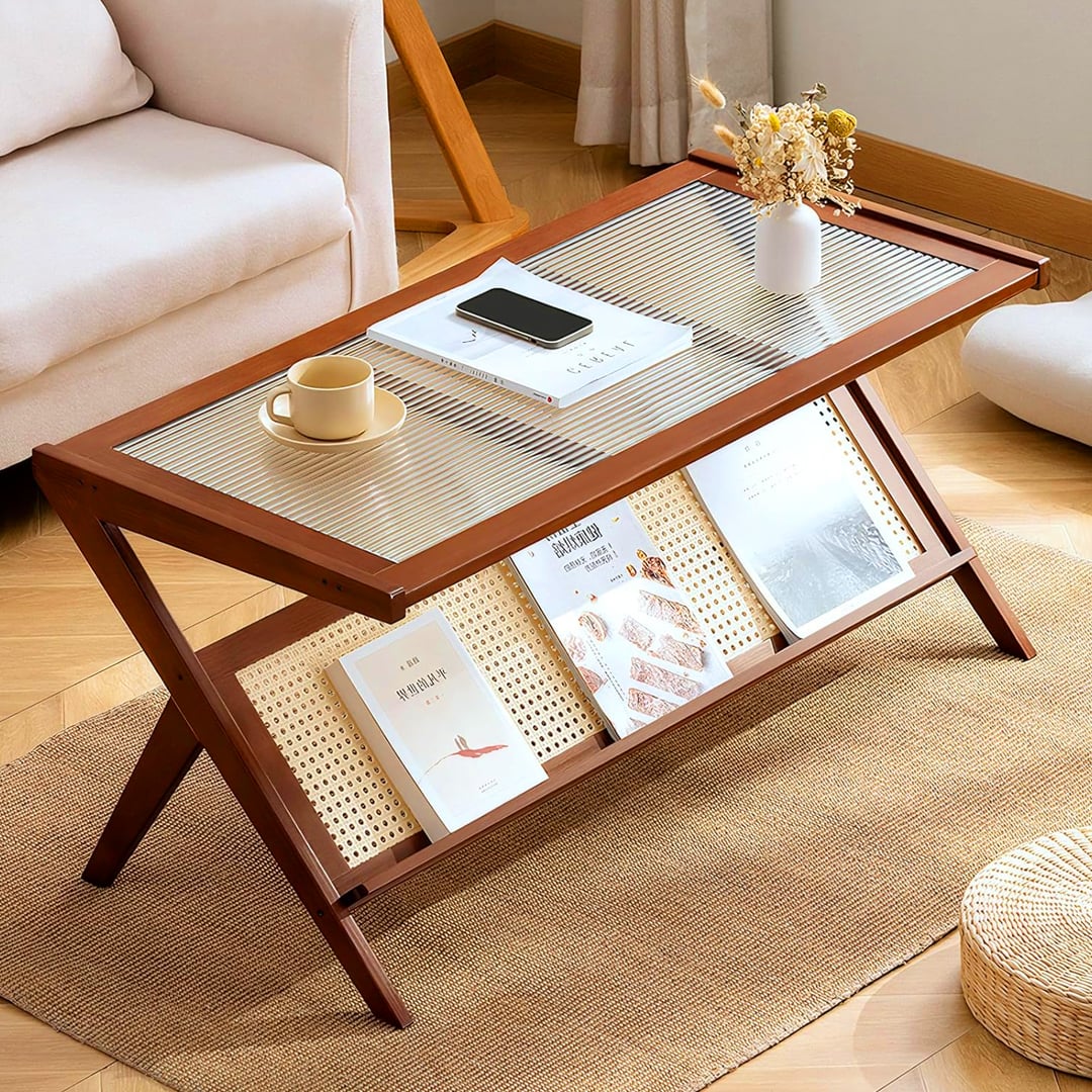 لمسة دافئة تجمع بين الخشب الطبيعي والزجاج الأنيق — طاولة قهوة عملية بسطح واسع ورف عرض سفلي لتنظيم المجلات والكتب، تمنح مساحتك توازنًا مثاليًا بين الجمال والوظيفة.