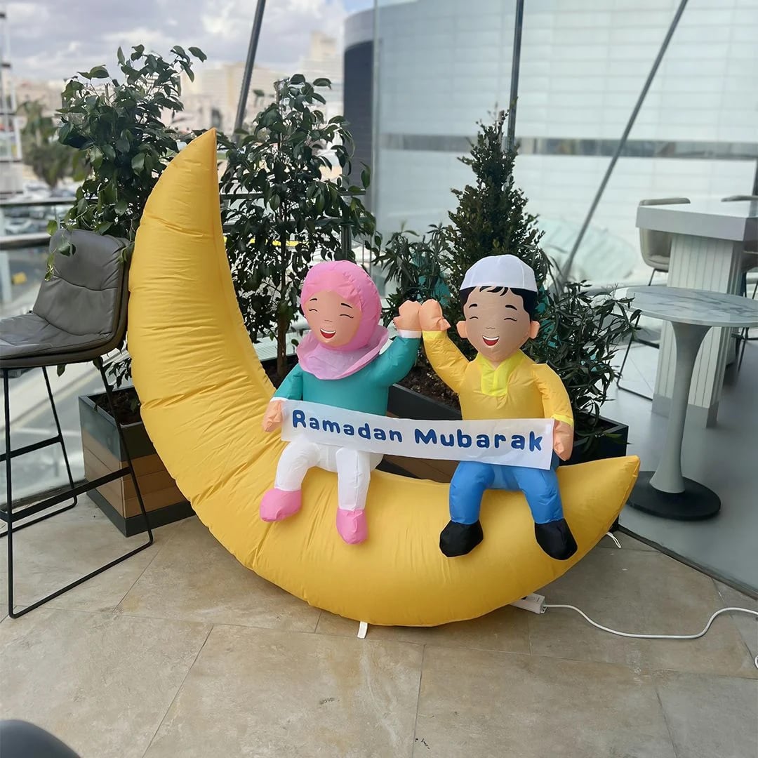 هوية تتجلّى في الديكور الرمضاني العائلي: مجسّم الهلال مع شخصيات كرتونية القابل للنفخ قطعة احتفالية مميّزة، صُمّمت لتجسّد فرحة رمضان والعيد بروح طفولية دافئة تجمع العائلة على البهجة والاحتفال. حضوره في المكان لا يقتصر على الزينة، بل يصنع لحظة فرح مشتركة تُدخل السرور إلى القلوب وتحول المساحات إلى مشهد رمضاني نابض بالحياة والضحكات.
