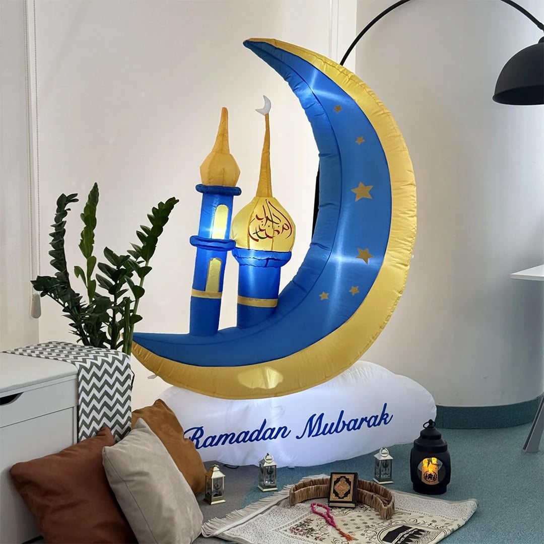 مجسّم الهلال والمئذنة القابل للنفخ، مضيء بتصميم عصري لافت، يضفي حضورًا احتفاليًا مميزًا ويحوّل باحة منزلك أو مطعمك أو أي مساحة تختارها إلى مشهد رمضاني نابض بالنور والبهجة.