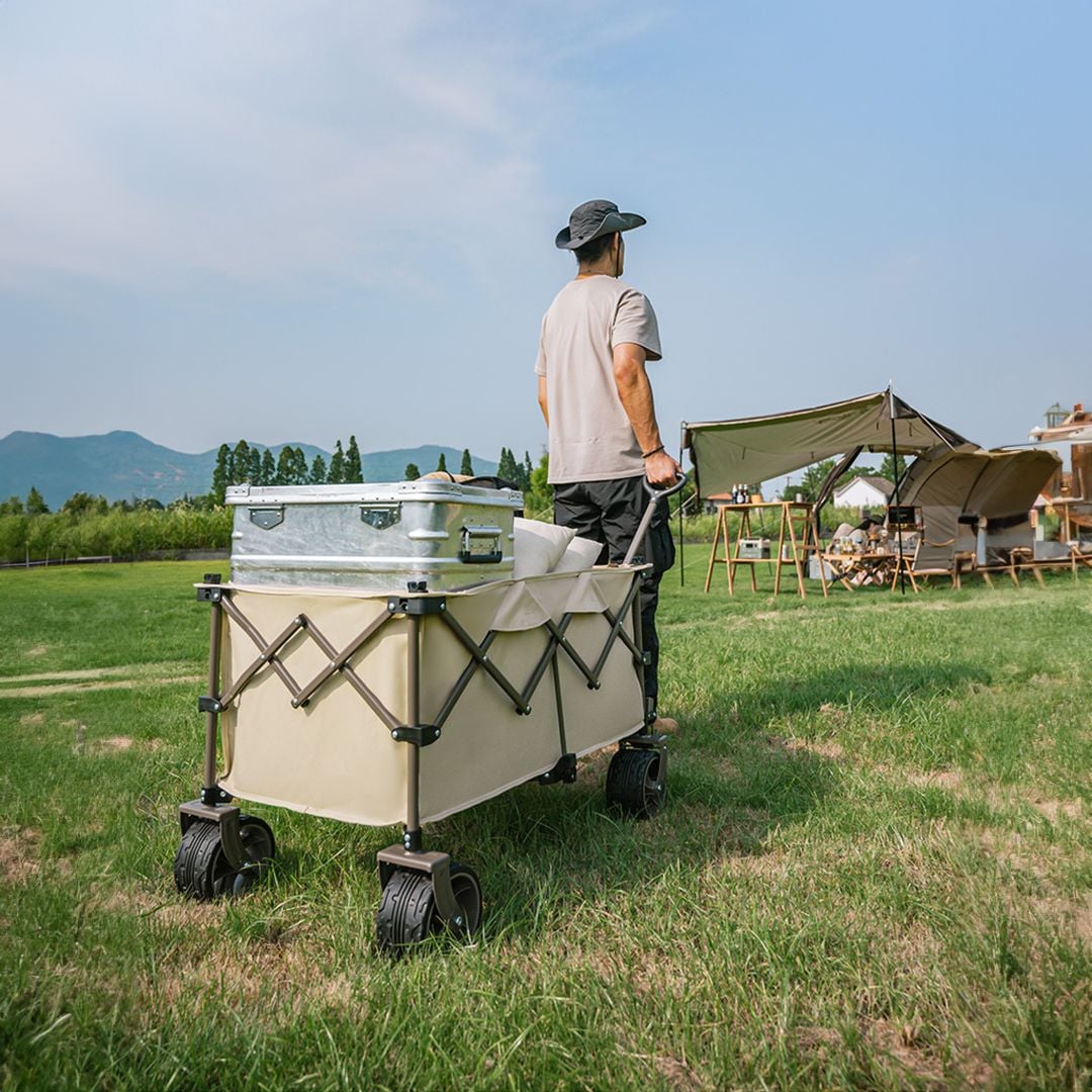 مقطورة او عربة رباعية بتصميم متين للتخييم و المغامرات و الرحلات قابلة للطي و العجلات تدور 360 درجة ، سهلة الحركة، ولا تأخذ حيز كبير عند وضعها في السيارة او عند التخزين مقبض الحركة لجر العربة يمكن التحكم به من حيث ابقاؤه واقفا او انزاله الى الأسفل يمكن وضع الغطاء العلوي فوق العربة لتصبح طاولة يمكن استخدامها للأكل عليها مصنوعة من هيكل قوي من الستانلس المضاد للماء او الصدأ ولا يتأثر بالعوامل الجوية قماش العربة مضاد للماء ايضا و قوي العربة تتمتع بسعة كبيرة لتخزين الأغراض مثل اغراض الرحلات او لنقل المعدات من مكان الى آخر الإطار فولاذي و شديد التحمل والعجال مطاطية متينة المقبض قابل للتعديل قماش العربة قابل للازالة ويمكن غسلة عند الحاجة يمكن للإطارات التعامل مع أي تضاريس كما يمكنها التحمل يمكن السيطرة على مقبض العربة بفضل المفصل الذي يعمل مكان قفل الأمان عند استخدام العربة وجرها تصميم العربة المضغوط يسهل عملية الطي بيد واحدة ؛ يوفر الوقت والمساحة ويسهل حمل جميع احتياجاتك سطح الطاولة او غطاء الطاولة مصنوع من الألومنيوم مع نمط الخشب، اذ يبدو مثل الخشب، لكنه ليس خشبًا