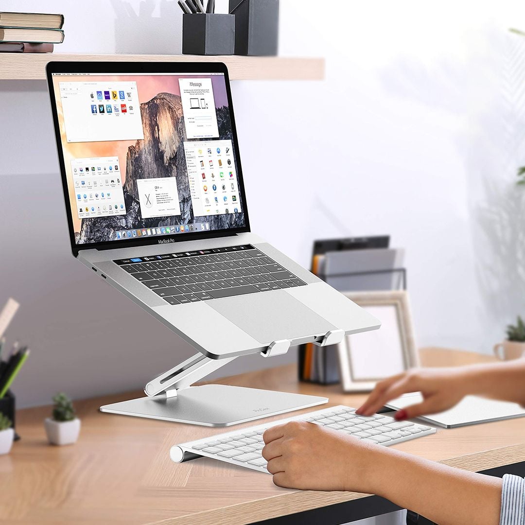 حامل لابتوب مع قاعدة، قابل للتعديل لتخفيف إرهاق الرقبة والجلوس بطريقة صحيحة من خلال رفع اللابتوب على مستوى نظرك