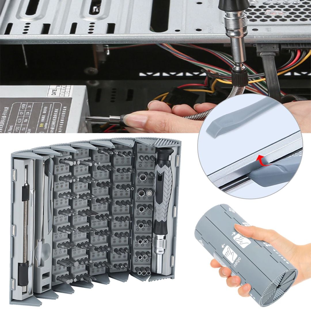طقم مفكات وبراغي 126 قطعة بداخل علبة أنيقة أداه حادة نوعا ما لفتح وفك القطع عن بعضها رأس مفك يمكن طيه للوصول الى الأماكن الضيقة ملقط صغير